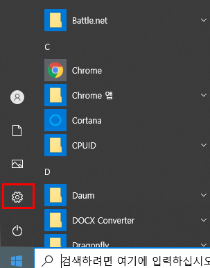 윈도우 시작키 클릭 후 환경설정 톱니바퀴를 누릅니다.