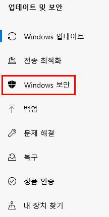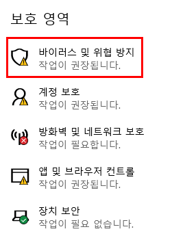 window 보안까지 클릭하셨으면...바이러스 및 위협 방지로 들어갑니다.