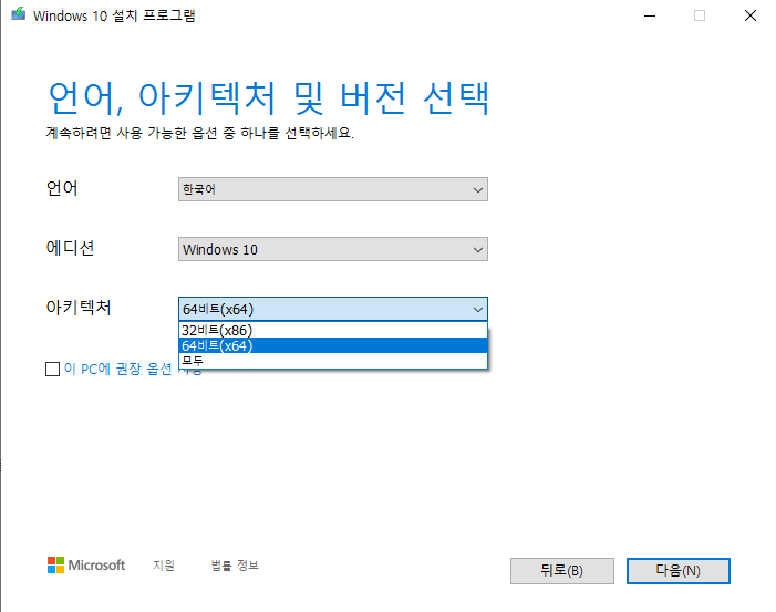 좌측 밑에 이 PC에 권장 옵션 사용...체크를 해제 하시면 WINDOW 32비트, 64비트, 또는