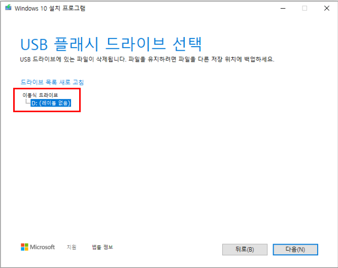 USB 드라이브 선택에서는 자동으로 USB가 인식되어진 드라이브를 찾아와 표시해 줍니다.