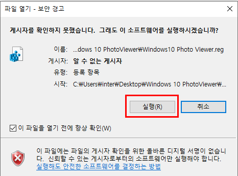 만약 window 사진 뷰어가 보이지 않는다면 레지스트리 조작으로 간단히 추가 시켜주시면 됩니다.